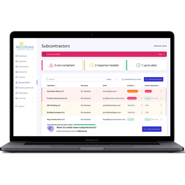 Upgrade to our Automated Tracking & Verification tools. For $1,200/year, you can track up to 50 subcontractors with AI and email automation handling the compliance process. For more than 50 subcontractors, purchase additional credits in packages of 10 for $150.