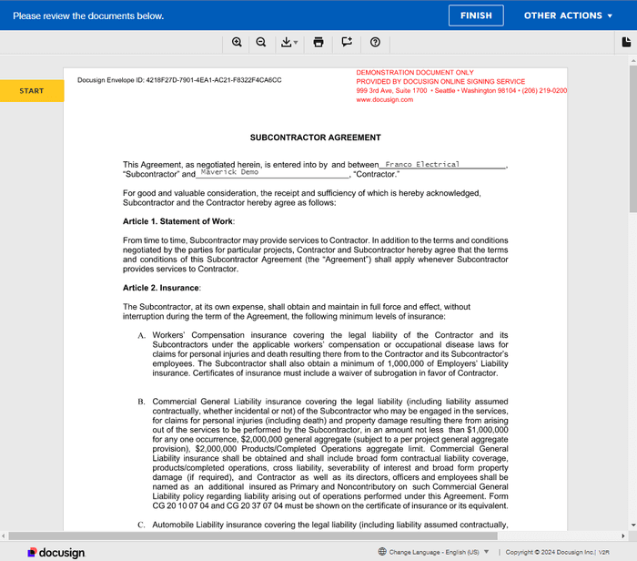 Yes, you can upload and track any agreement with the manual upload option. The automated DocuSign feature currently supports the standard Maverick-recommended subcontractor agreement.