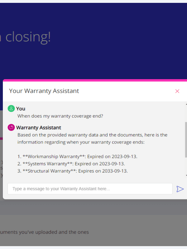 Warranty AI Assistant integrates seamlessly into your existing homeowner portal. This means your homeowners can access support right where they're already managing their home-related information. All they have to do is type in a question, and Warranty AI Assist will respond based on their warranty document and NAHB performance standards.